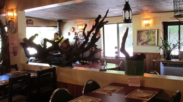 In lieu of a menu we were told there was eel and trout. “We’ll have the eel and the trout, then,” I said. “It will be about 20 minutes. You can walk around the pond outside. Very pretty,” the chef instructed in slightly halting English. We nodded, but first I had to take, with her permission, a bunch of photos of the interior, which was an odd hodgepodge. Nothing much matched anything else. The artwork was strange and surprising (for want of a better description) and there were quite a few stuffed animal heads protruding from the walls, as well as an entire small creature or two, perhaps beaver or possum, I couldn’t tell. A taxidermist somewhere had been kept busy.
