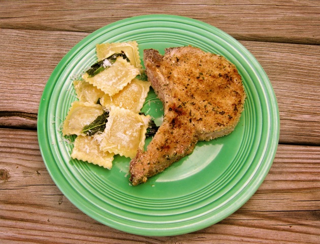 Epilogue: I have made hunter’s chicken many times in my life, but have only recently begun to add meat to my diet after over three decades of abstention. The pork chop, I have found, is a delight. I’d forgotten how flavorful, chewy (in a good way), and sustaining it can be, and I now often pan fry or stove-top grill bone-in chops. Contrary to past belief, it is now acceptable to eat your pork with a touch of pink in its center, and I find it more tender and succulent that way. I sometimes serve the crisp-coated chops with sautéed apples, as an ode to my mom, but I’ve also been known to accompany them with spinach and cheese ravioli tossed with butter and sage or creamed spinach.