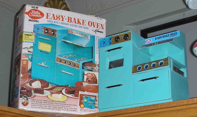 It was the early sixties and Sunday mornings, while the family slept, I watched cartoons, eagerly awaiting the commercial advertisements for the Easy Bake Oven. Young girls in starched pinafores over stiff crinolines stood at a table mixing and spooning batter into teeny cake pans. Their creations magically solidified under a small white light bulb while riding along a conveyer belt. Out came delicacies to be decorated with icing and brightly colored sprinkles. Everyone ate and laughed, and they were clearly so proud of what they’d created.