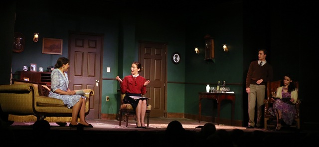 To jump start a serpentine, mysterious plot and a plethora of whimsical characters the local newspaper in the country village of Chipping Cleghorn, UK prints a curious, intriguing announcement: There will be a murder that night at Little Paddocks, home of the stately Letitia Blacklock, and several intriguing guests. Sandy York, as Letitia more than fully represents the embodiment of an uppity British woman. And as an acute audience might suspect, there is a murder! And it’s just a moment after the stage goes to black! Convenient? Of course. But that’s theatre and the appropriate insertion or inclusion of such devices is what makes a mystery drama work. And this play does work! The characters are quirky and a tad on the odd side, but let them lie. Ellen Pavloff as Dora Bunner is enjoyably batty and more than just delightful. Carolann Page is brilliant as Miss Marple. She holds the stage and acutely projects a credible image of a smart, unassuming, woman with a crafty and oh so suspicious gaze. Chris Van Cleave dominates the stage as the curt, just-the-facts ma’am, Inspector Craddock. The charming and always attractive Chiara