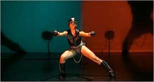 A most curious portrayal in movement of a modern-day leather / cycle person, “Narcissus Rising,” (photo right) performed by Donna Clark. Dressed in what one considers male leather attire, Ms. Clark elegantly offered up male movements and postures as a serious expression and a non-judgmental comment on the male sexual connection to motorcycles and leather. Perhaps the ladies in the audience did not see this as a male expression, but I did not ask my guest or others how they saw it.