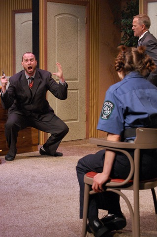 Accompanying Blain on his original mission, the collection of evidence, is a young, inexperienced policewoman in training. Susan Slotorff is exceptional in this role. Her ability to accentuate the ridiculous and accommodate the improbable makes this farce work. For her part the timing of the interactions with the other characters is critical, a significant portion taking place on the far side of an invisible wall. If she’s not in synch the humor is lost. But, not to worry. She has it and is the show’s delight. Further, appreciate the ability of other cast members, as each performs with the precision of trained trapeze artist on the high wire; they’re in one door, out the other. Slam! Bam! Oh, now a headache, too! Timing, timing, it’s all in the timing.